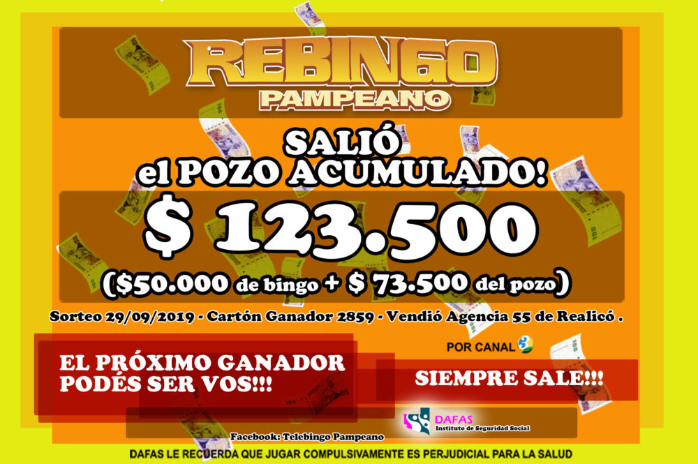 Salió el POZO ACUMULADO de REBINGO 30 septiembre, 2019 Pablo Osio Share List Atención Realicó! Salió el POZO ACUMULADO de REBINGO Cartón ganador Nº 2859 – Vendido por Agencia Oficial Nº55 de Realicó – ¡Controlá tu cartón! Sorteo realizado el domingo 29 de Septiembre de 2019.