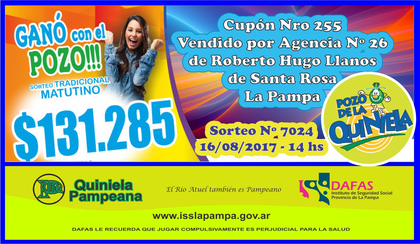 El sorteo matutito Nº 7024 de ayer, 16 de agosto, arrojó como resultado un/a apostador/a favorecido/a con la suma de 131.285 pesos. El cupón ganador es el Nº 255, que fue vendido por la agencia 26 de Santa Rosa, de Hugo Llanos.