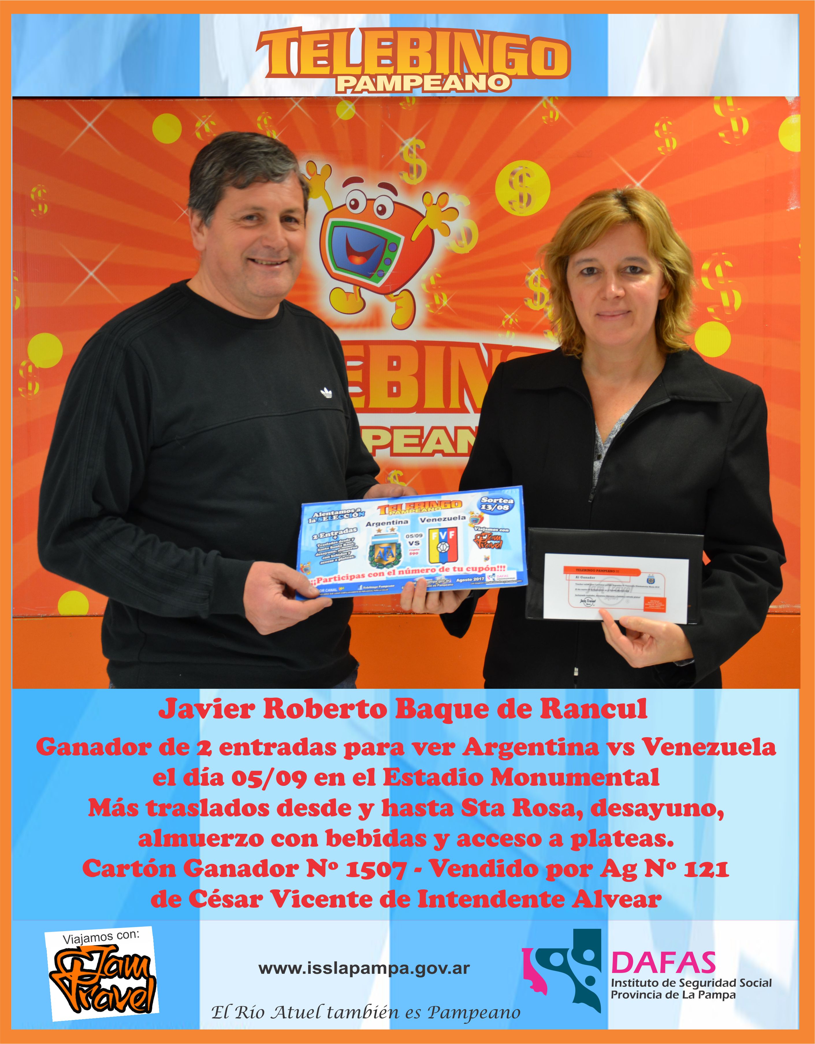 Con el número de cartón 1507 vendido por la Agencia 121 de Intendente Alvear (de César Vicente), el ganador del sorteo del Telebingo Pampeano realizado el lunes 14 de agosto fue Javier Roberto Baque, de la localidad de Rancul.