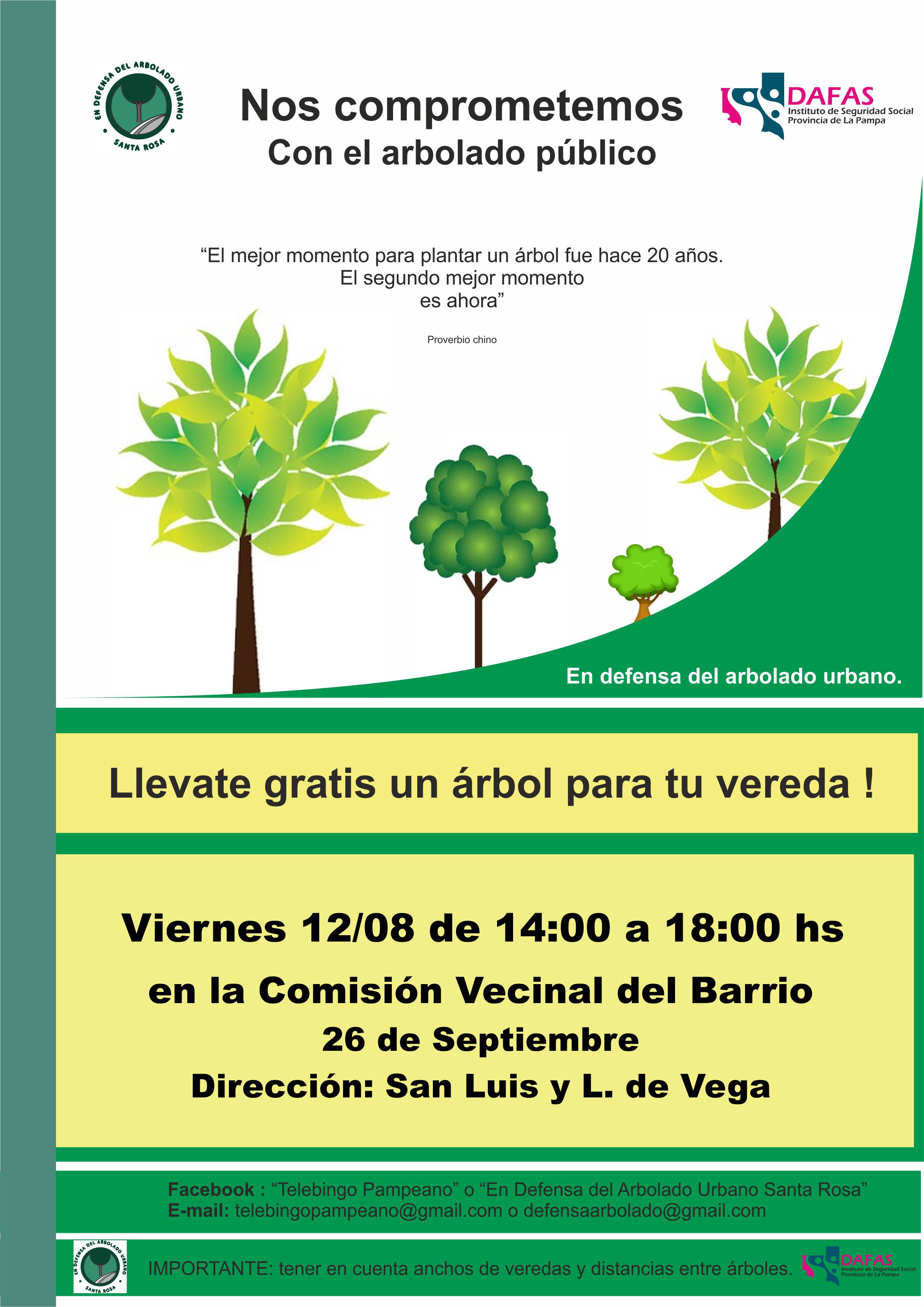 Share List Culmina entrega de árboles en el edificio de DAFAS Sostenida por el entusiasmo y la organización e ímpetu de sus promotores, la agrupación en Defensa del Arbolado Urbano Santa Rosa, comisiones vecinales y DAFAS, el próximo 29 de agosto en coincidencia con el Día del Árbol culminará la