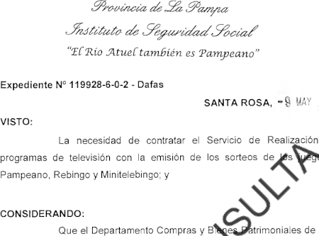 Share List Se autoriza a la Dirección de Ayuda Financiera para la Acción Social a efectuar el llamado a Licitación Pública n° 01/23, para contratar el servicio de Realización Integral de programas de televisión con la emisión de los sorteos de los juegos Telebingo Pampeano, Rebingo y Minitelebingo. <p></p>