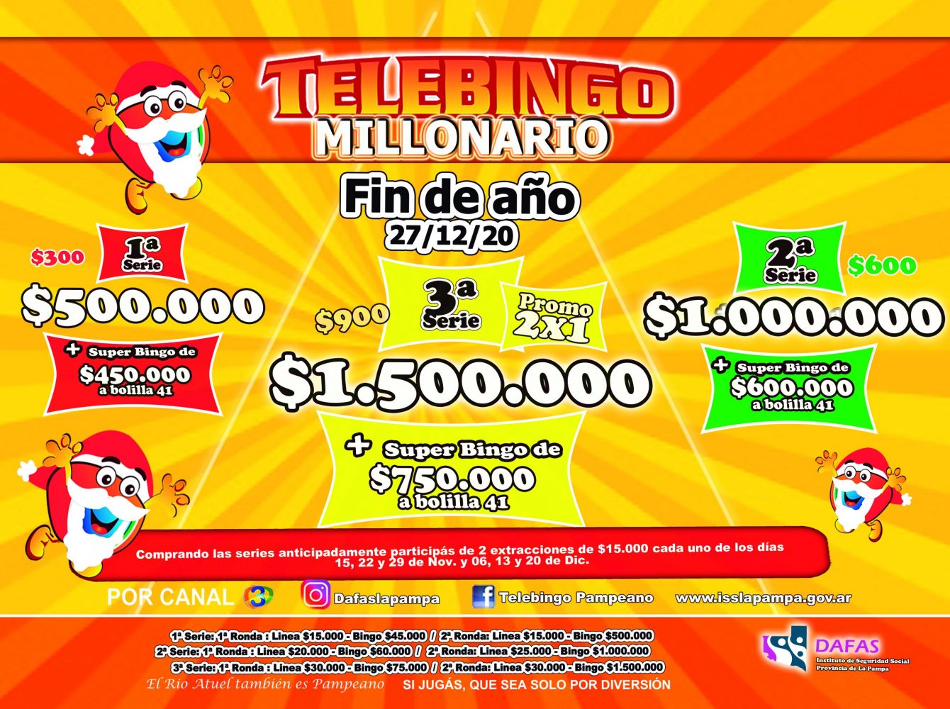 Share List Telebingo Pampeano pone en juego premios multimillonarios El próximo 27 de diciembre será el tradicional sorteo de fin de año de Telebingo Pampeano, que en esta edición pone en juego más de 5 millones de pesos en premios. Será televisado por Canal 3, Facebook en vivo y nuestro