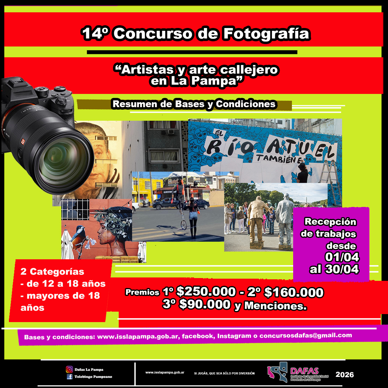 Share List DAFAS anuncia 14° concurso de fotografía “Arte y artistas callejeros de La Pampa” La Dirección de Ayuda Financiera para la Acción Social (DAFAS) invita a participar durante todo el mes de abril del 14° concurso de fotografía digital “Arte y artistas callejeros de La Pampa”, a desarrollarse con