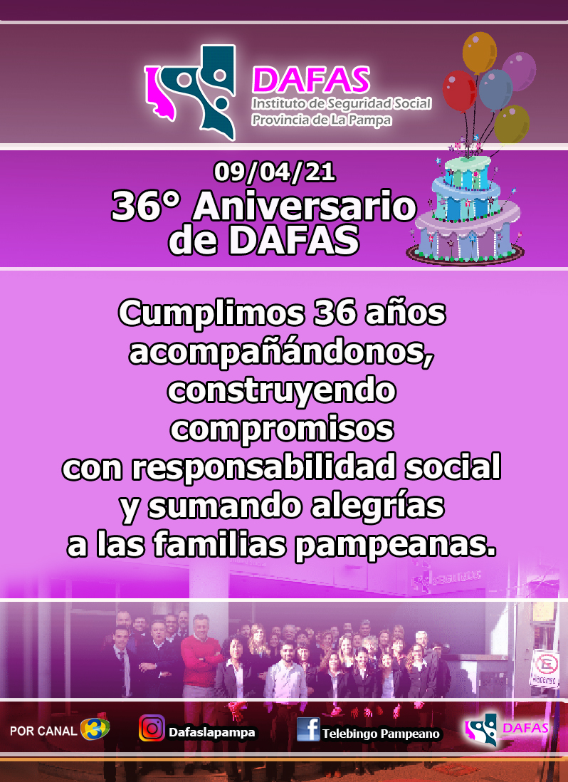 Share List La Dirección de Ayuda Financiera para la Acción Social (DAFAS), entidad que regula el juego oficial en La Pampa, cumple este 9 de abril 36 años de trayectoria institucional en la provincia. La fecha es propicia para agradecer al público apostador y a la amplia red de comercialización,