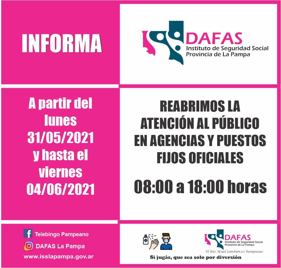 Share List A partir de mañana lunes 31 de mayo y hasta el viernes 4 de junio de 2021, de acuerdo a lo establecido por el Gobierno provincial, agencias y puestos fijos oficiales de la Dirección de Ayuda Financiera para la Acción Social (DAFAS) abrirán al público en cumplimiento con