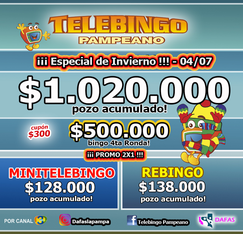 Share List Con premios millonarios Telebingo Pampeano sortea el Especial de Invierno El próximo domingo 4 de julio Telebingo Pampeano pondrá en juego un pozo acumulado de 1.020.000 de pesos a bolilla 41, además de un premio a bingo en la cuarta ronda de 500.000 pesos. Quienes adquieran los cartones