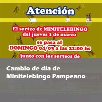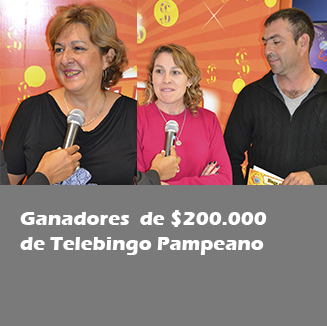 Share List Ganadores Telebingo Pampeano Bingo 4 Ronda – Premio $ 200.000 Sorteo Nº863- 25/03/18 9613 – Argañin, Adriana V. – Santa Rosa Sorteo Nº864 – 01/04/17 9257 – Gómez, Carlos J. – Int. Alvear
