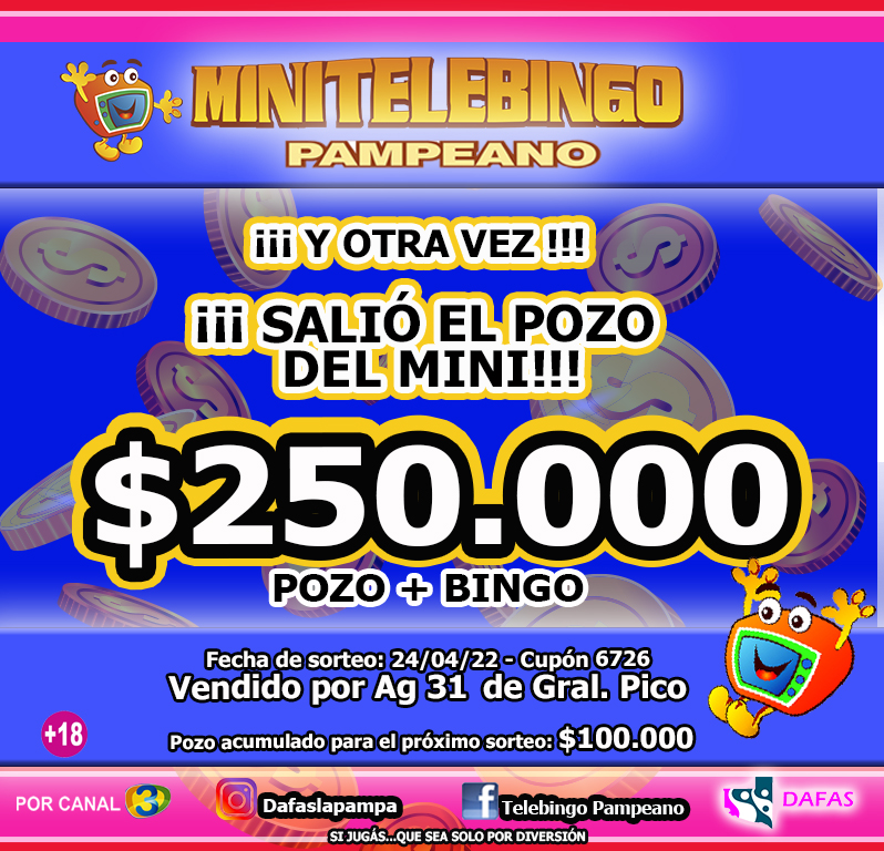 Share List Salió el pozo del Minitelebingo Pampeano Una persona que compró el cartón de Minitelebingo Pampeano Nº 6726, en la agencia 31 de General Pico, ganó 250.000 pesos (pozo acumulado más el bingo). El pozo acumulado salió sorteado hace una semana atrás y en esa ocasión benefició a una