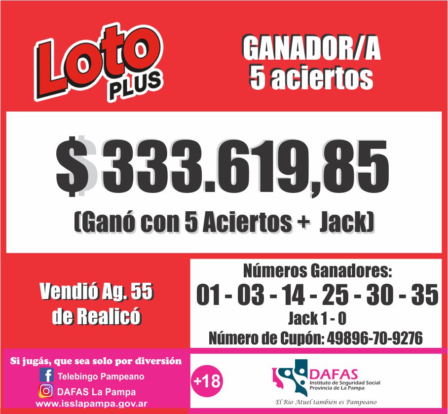 Share List El cupón ganador fue el N° 49896-70-9276 con los números 01, 03, 14, 25, 30 y 35 – Jack 1 y 0 – en el Sorteo del Loto Plus. La apuesta fue realizada en la Agencia Oficial número 55 de la localidad de Realicó.