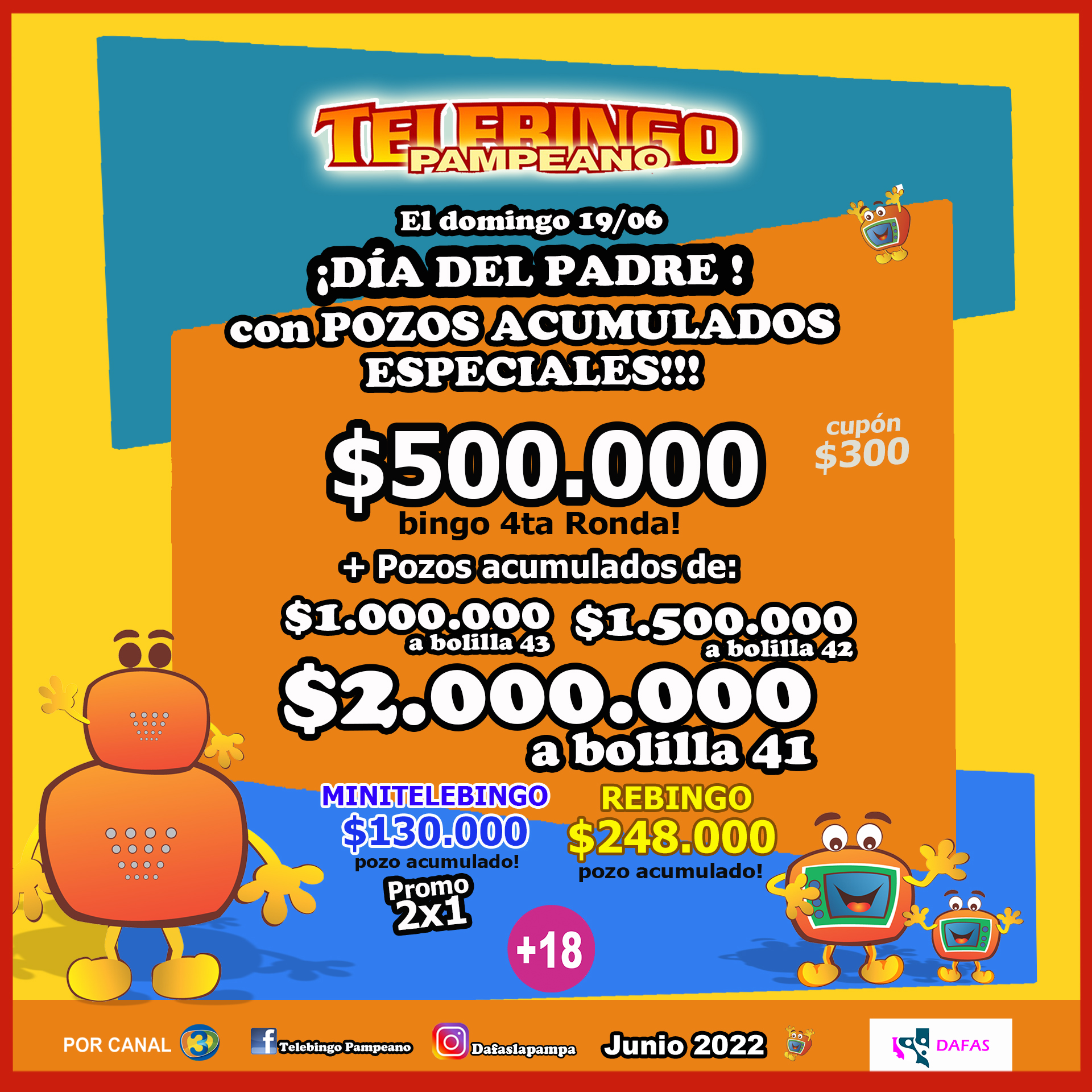 Share List Telebingo Pampeano sortea tres pozos millonarios para el Día del Padre Telebingo Pampeano -uno de los juegos que comercializa la Dirección de Ayuda Financiera para la Acción Social (DAFAS)- realizará el próximo domingo 19 de junio un sorteo que pone en juego a bolilla 41 un pozo acumulado