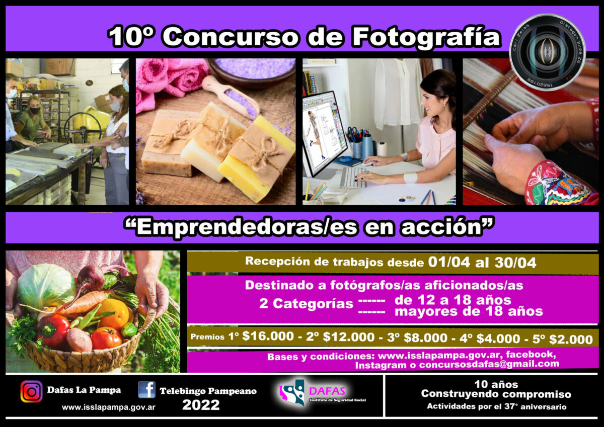 Share List En el marco del 10° aniversario del Programa de Responsabilidad Social de la Dirección de Ayuda Financiera para la Acción Social (DAFAS), durante todo el mes de abril del 2022 se recibirán trabajos para participar del 10° Concurso de fotografía digital “Emprendedoras/es en acción”. En esta nueva edición