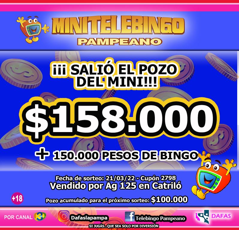 Share List En el sorteo especial realizado el día lunes 21 de marzo de 2022 en la bolilla 41 salió el Pozo Acumulado, el cartón favorecido es el número 2798 y fue vendido por Santiago Delfino de la Agencia Oficial nro 125 de la localidad de Catriló El ganador/a fue