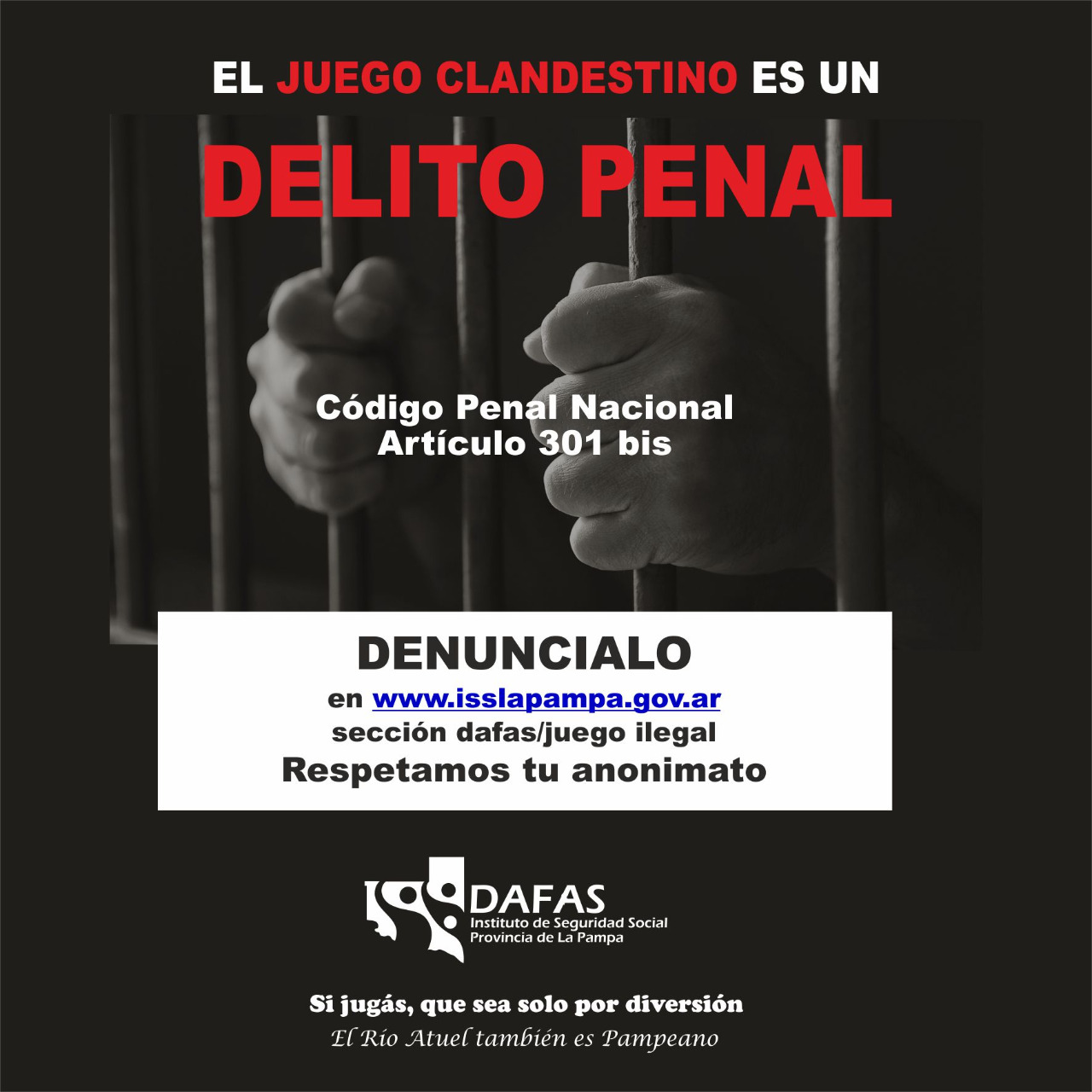 Share List El Código Penal de la Nación reprime con prisión de 3 a 6 años a quien organice y explote juegos de azar no autorizados por nuestro organismo. Invitamos a la población en general a utilizar como herramienta de denuncia segura y anónima el sitio web https://www.isslapampa.gob.ar/dafas_juego_ilegal/ https://www.isslapampa.gob.ar/wp-content/uploads/2022/03/DAFAS-Juego-ilegal-video_redes.mp4