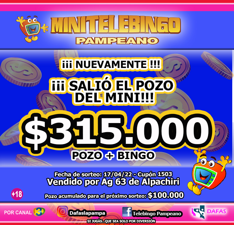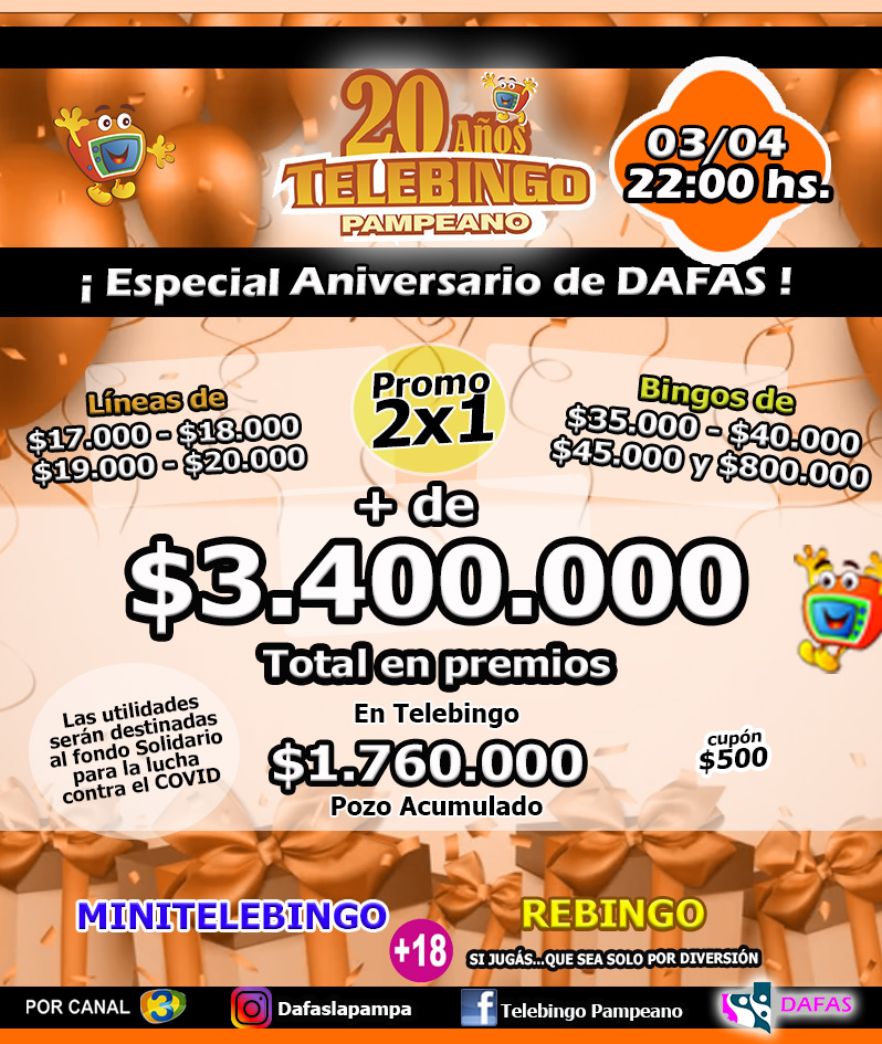 Share List Telebingo Pampeano -uno de los juegos que comercializa la Dirección de Ayuda Financiera para la Acción Social (DAFAS)- realizará el próximo domingo 3 de abril a las 22 horas un sorteo especial por el 37° aniversario de la institución, que será televisado en vivo por Canal 3, Facebook,