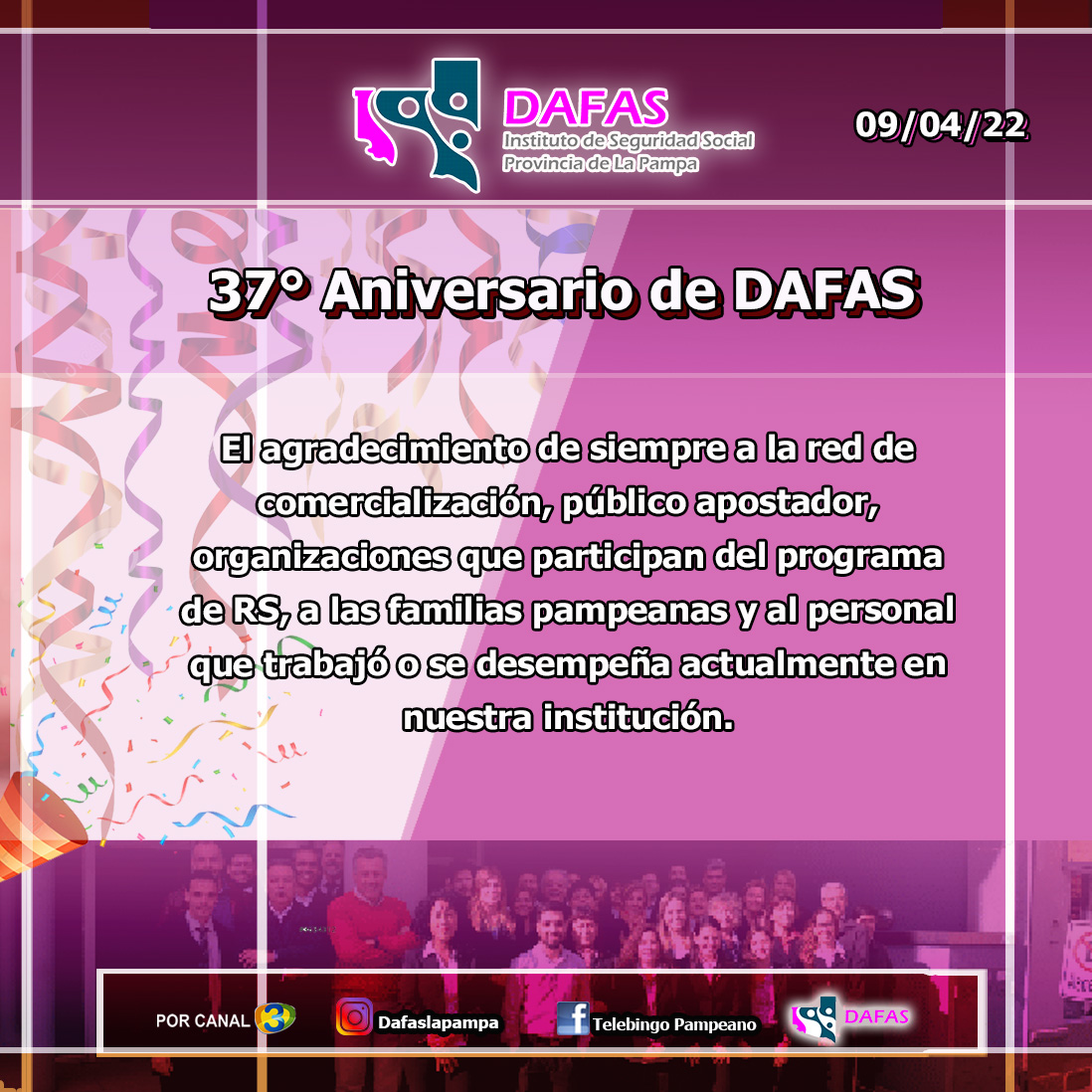 Share List DAFAS celebra hoy 9 de abril, 37 años de trayectoria y crecimiento institucional. El agradecimiento de siempre a la red de comercialización, público apostador, organizaciones que participan del programa de RS, a las familias pampeanas y al personal que trabajó o se desempeña actualmente en nuestra institución.