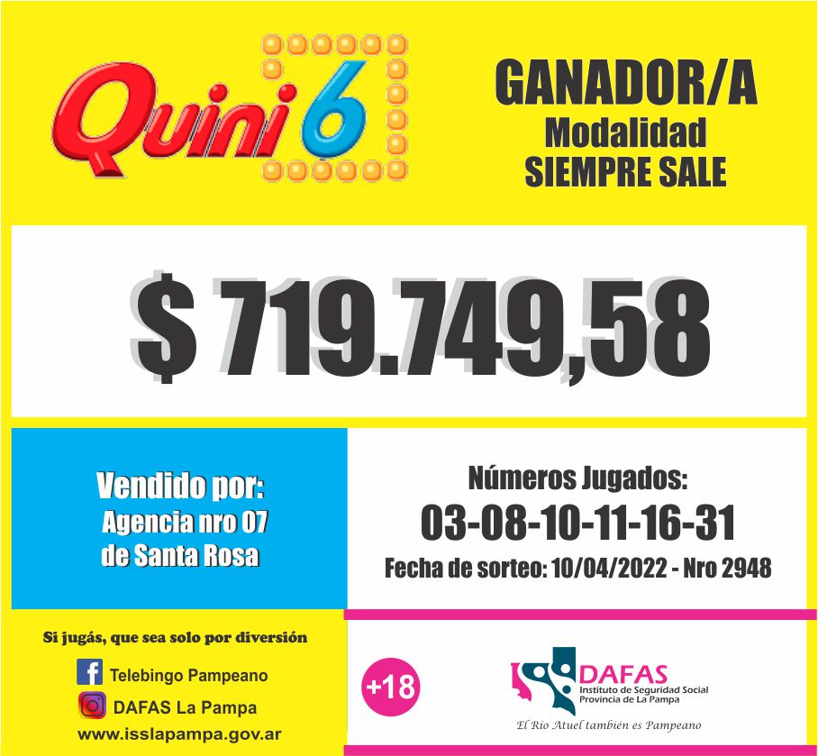 Share List Una persona que compró el cupón en la agencia oficial número 07 de Santa Rosa, tuvo 5 aciertos con los números 03, 08, 10, 11, 16 y 31 y ganó 719.749,58 pesos, en el sorteo del Quini 6 que se desarrolló el pasado 10 ed Abril de 2022.