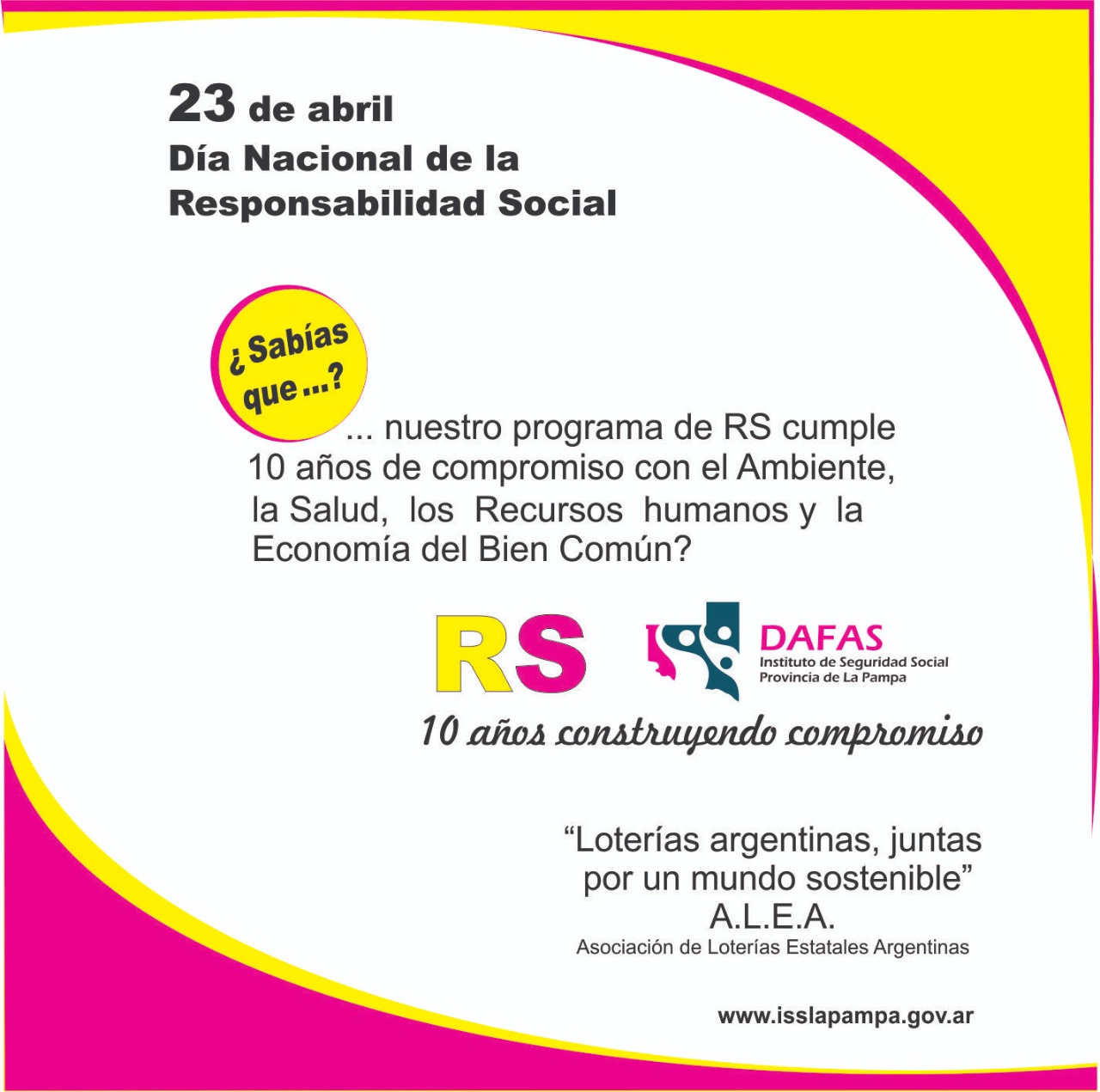 Share List En nuestro país, el próximo 23 de abril se conmemora el Día Nacional de la Responsabilidad Social. ALEA junto a sus miembros activos, las #loteríasargentinas, y sus miembros adherentes, las principales empresas proveedoras de juegos de azar, ratifica en esta fecha su compromiso de trabajo mancomunado para la