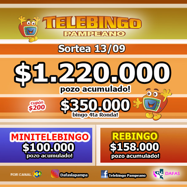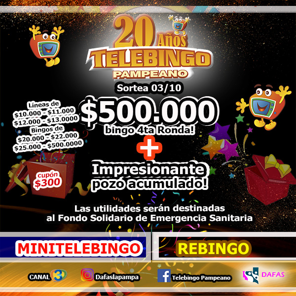 Share List Telebingo Pampeano -uno de los juegos que comercializa la Dirección de Ayuda Financiera para la Acción Social (DAFAS)- realizará el próximo 3 de octubre un sorteo especial por su 20° aniversario. Será televisado en vivo por Canal 3, a través de la página de Facebook y el canal