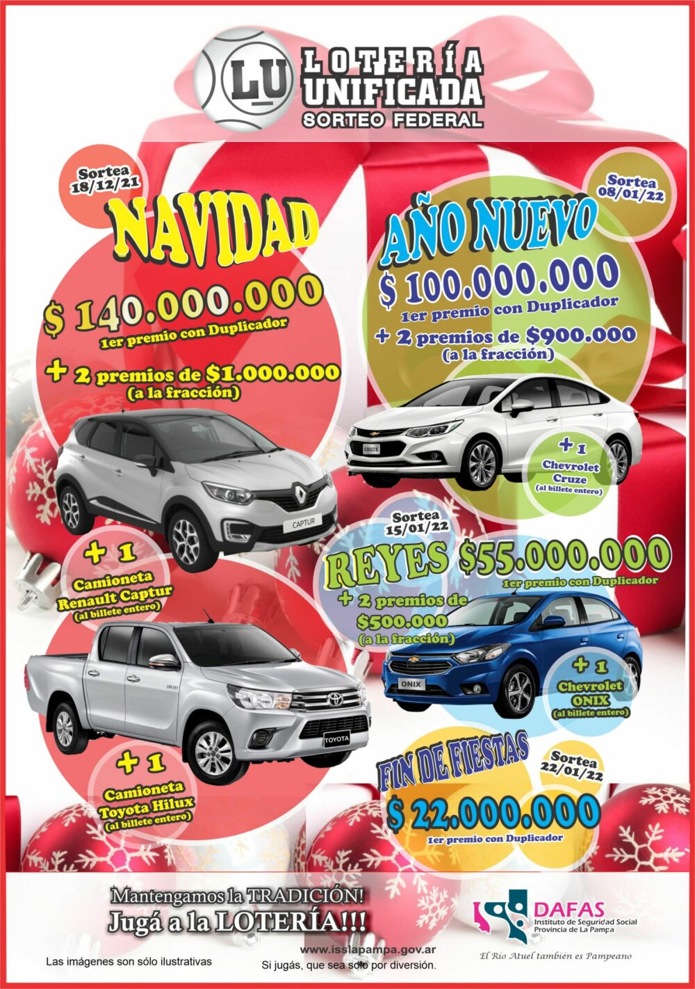 Share List Como ya es tradición para esta fecha, DAFAS y su red de comercialización ponen a la venta los sorteos de Fin de Año de Lotería Unificada que tienen premios millonarios, además de autos y camionetas en sucesivos sorteos vinculados a las fiestas de fin de año. Para el