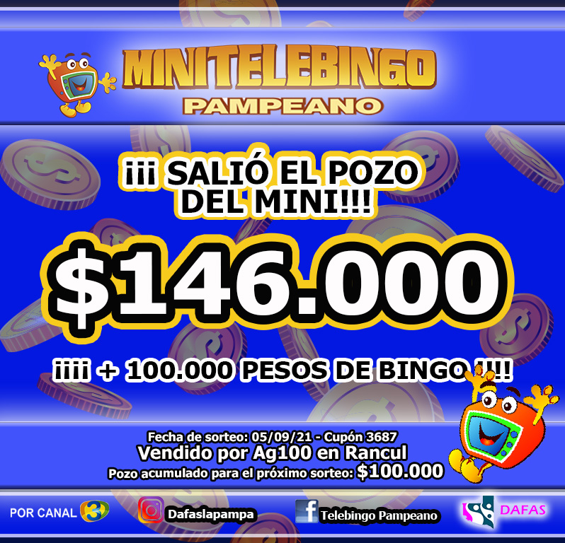 Share List ¡Felicitaciones ganador o ganadora del pozo acumulado de Minitelebingo Pampeano! El premio fue vendido por la agencia 100 de la localidad de Rancul. TELEBINGO PAMPEANO, ¡siempre sale!