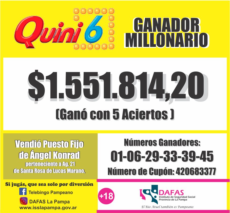 Share List Una persona con el cupón N° 420683377 acertó con los números 01, 06, 29, 33, 39 y 45 y ganó 1.551.814,20 de pesos en el Sorteo del Quini 6 del 20 de octubre. La apuesta fue realizada en el puesto fijo de Ángel Konrad ubicado en la Avenida