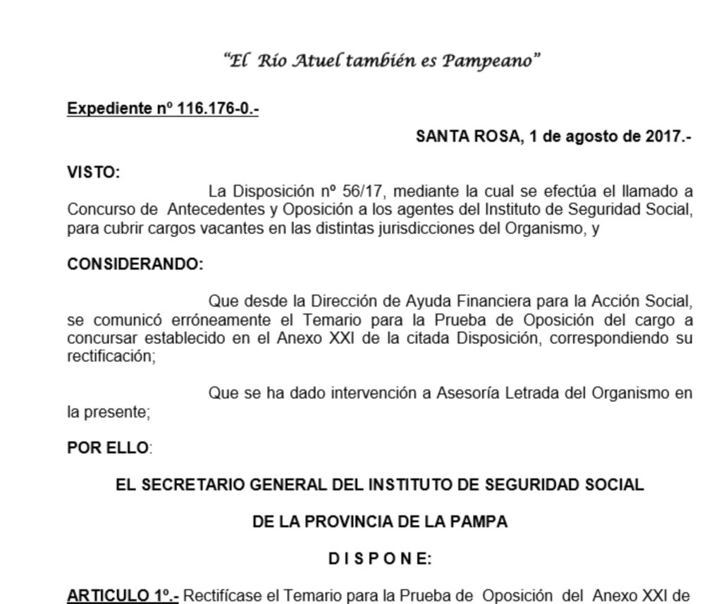 Share List Ver original Expediente Nº 116.176-0.- SANTA ROSA, 1 de agosto de 2017.- VISTO: La Disposición nº 56/17, mediante la cual se efectúa el llamado a Concurso de Antecedentes y Oposición a los agentes del Instituto de Seguridad Social, para cubrir cargos vacantes en las distintas jurisdicciones