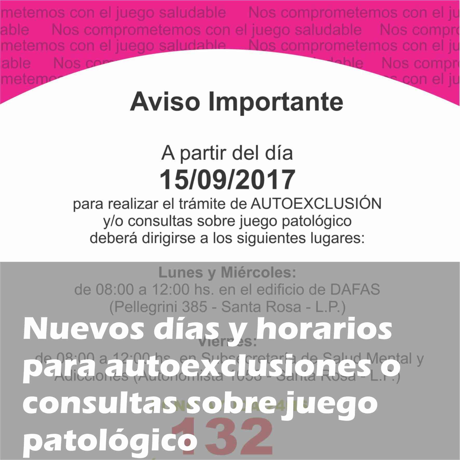 Share List Nuevos días y horarios para autoexclusiones o consultas sobre juego patológico La Dirección de Ayuda Financiera para la Acción Social (DAFAS) comunica que a partir de mañana viernes 15 de septiembre las personas interesadas en realizar el trámite de autoexclusión o efectuar consultas sobre juego patológico, podrán hacerlo