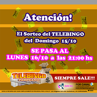Share List CON TELEBINGO PAMPEANO ¡¡¡ALENTAMOS A LA SELECCIÓN !!! A partir del 1º de agosto en cualquier Agencia Oficial de DAFAS podés adquirir un cupón para el sorteo del día domingo 13 (que se pasa para el lunes 14 a las 22 horas). Se sortearán 2 entradas para el