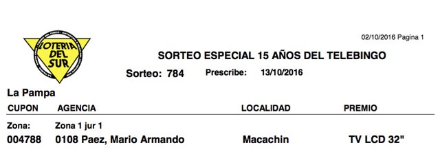 Share List TELEBINGO ENTREGÓ PREMIO DEL SORTEO “ESPECIAL DÍA DE LA MADRE” Sorteo Nº 786 – Telebingo Pampeano – Especial día de la madre – Domingo 16 de octubre de 2016 – > Cartón ganador Nº 4953 – Vendió Agencia Nº 86 de Rubén Horacio Gutierrez de Embajador Martini > Premio: $250.000
