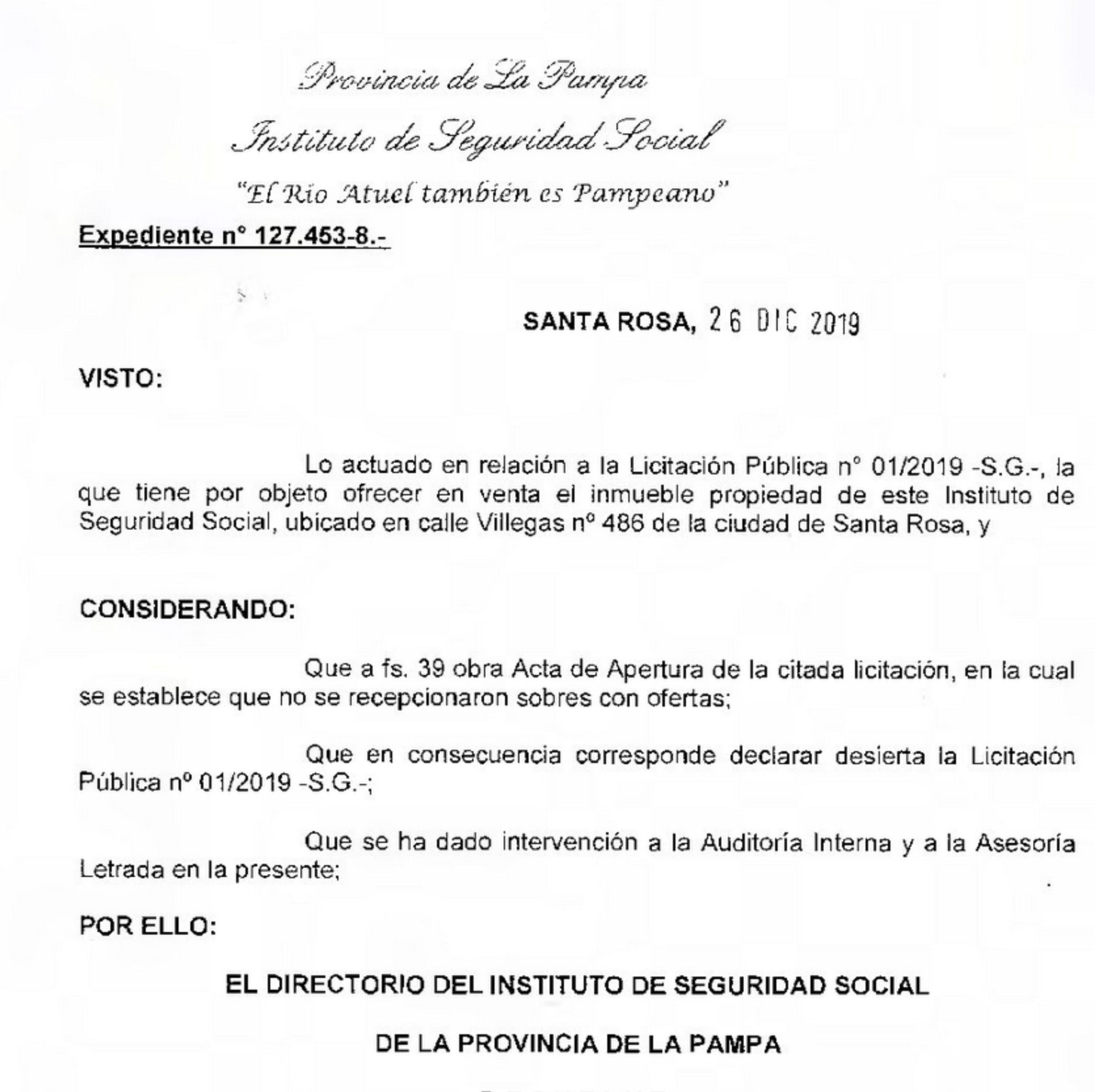 Share List Autorízase a la Secretaría General del ISS a efectuar el llamado a Licitación Pública N° 01/20 para la venta del inmueble en calle Villegas n° 486 de la ciudad de Santa Rosa, en el día y hora que se estime pertinente.
