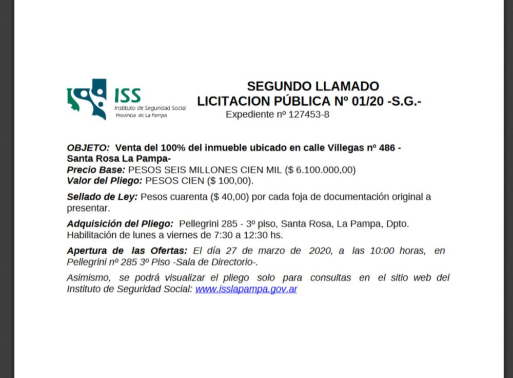 Share List Autorízase a la Secretaría General del ISS a efectuar el llamado a Licitación Pública N° 01/20 para la venta del inmueble en calle Villegas n° 486 de la ciudad de Santa Rosa, en el día y hora que se estime pertinente.