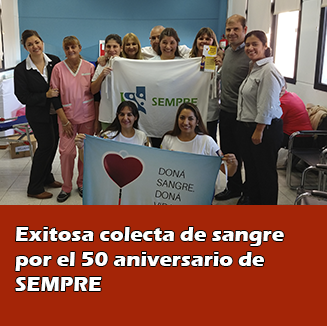 Share List Exitosa colecta de sangre por el 50 aniversario de SEMPRE Como parte de las actividades organizadas para celebrar el 50 aniversario, se realizó hoy en el edificio del SEMPRE una exitosa campaña de donación de sangre, organizada conjuntamente con el Banco de Sangre del Hospital Lucio Molas. Trabajadores/as