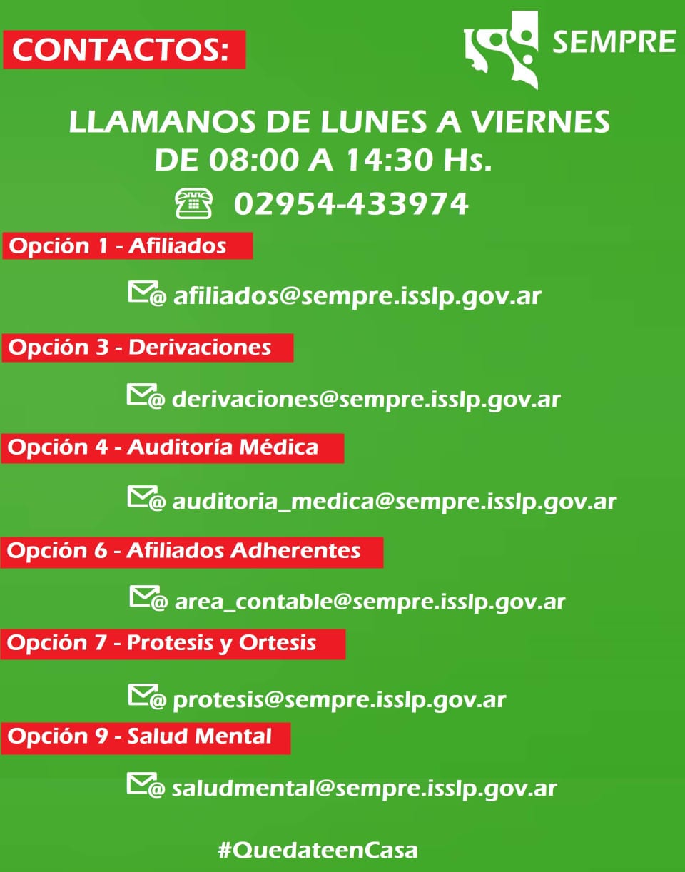 Share List SEMPRE solicita canalizar consultas a través del 107 El Servicio Médico Previsional (SEMPRE) informa a sus afiliados de La Pampa y residentes en otras provincias que aplica el protocolo de Nación respecto a infecciones por Coronavirus. Ante la sospecha o dato epidemiológicamente positivo para tal infección, deberán comunicarse
