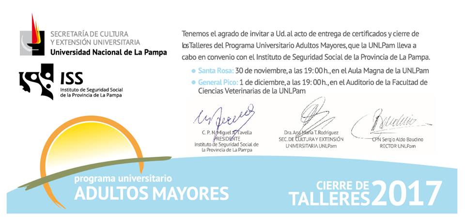 El Aula Magna de la UNLPam será sede mañana jueves 30 de noviembre del acto de cierre de actividades 2017 del Programa Universitario de Adultos Mayores (PUAM) que impulsa la Universidad Nacional de La Pampa en financiamiento conjunto con el Instituto de Seguridad Social (ISS).