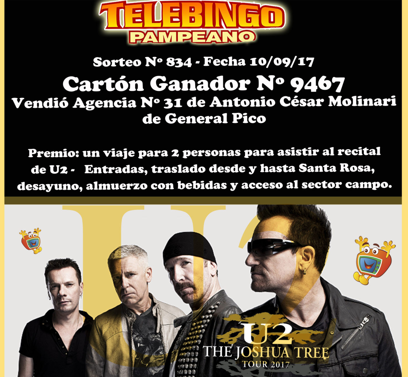 Dafas – 1er Ganador de las entradas de U2 4 septiembre, 2017 Pablo Osio Share List 1er Ganador para ir a ver a U2 Sorteo Nº 834 – Fecha 10/09/17 Cartón Ganador Nº 9467 Vendió Agencia Nº 31 de Antonio César Molinari de General Pico
