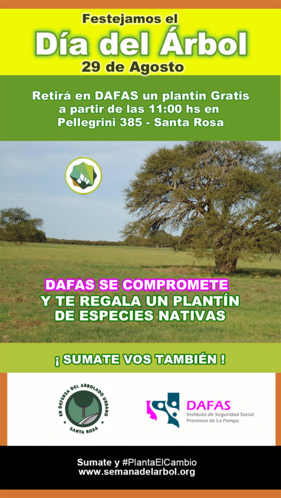 Junto a la agrupación en Defensa del Arbolado Urbano Santa Rosa y en coincidencia con el Día del Árbol, DAFAS entregará plantines de especies nativas el próximo martes 29 de agosto a partir de las 11 horas en la sede de su edificio.