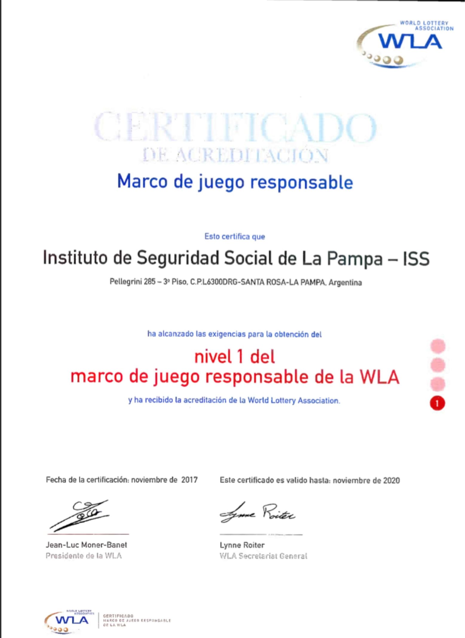 Las exigencias para la obtención del Nivel 1 del marco de Juego Responsable de la WLA fueron debidamente presentadas ante la Asociación de Loterías, Quinielas y Casinos Estatales de Argentina (ALEA).
