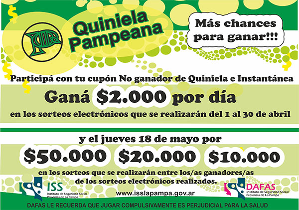 - Participarán de los sorteos especiales los cupones no ganadores de apuestas de Quiniela Pampeana en todas sus modalidades (Primer Sorteos, Matutinos, Vespertinos y Nocturnos), efectuados por todos los extractos por los que sortea D.A.F.A.S. y los cupones no ganadores de Quiniela Instantánea.