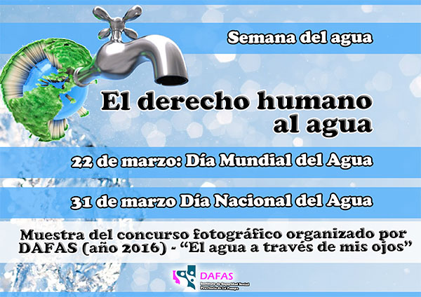 Con motivo de conmemorarse hoy 22 de marzo el Día Mundial del Agua y el próximo 31 el Día Nacional del vital recurso, DAFAS organizó la exposición de la muestra “El agua a través de mis ojos”. Será en la jornada de hoy en el frente de nuestro edificio y del 23 de marzo al 3 de abril en las vidrieras del Instituto de Seguridad Social, en Pellegrini y 9 de Julio de la ciudad de Santa Rosa.