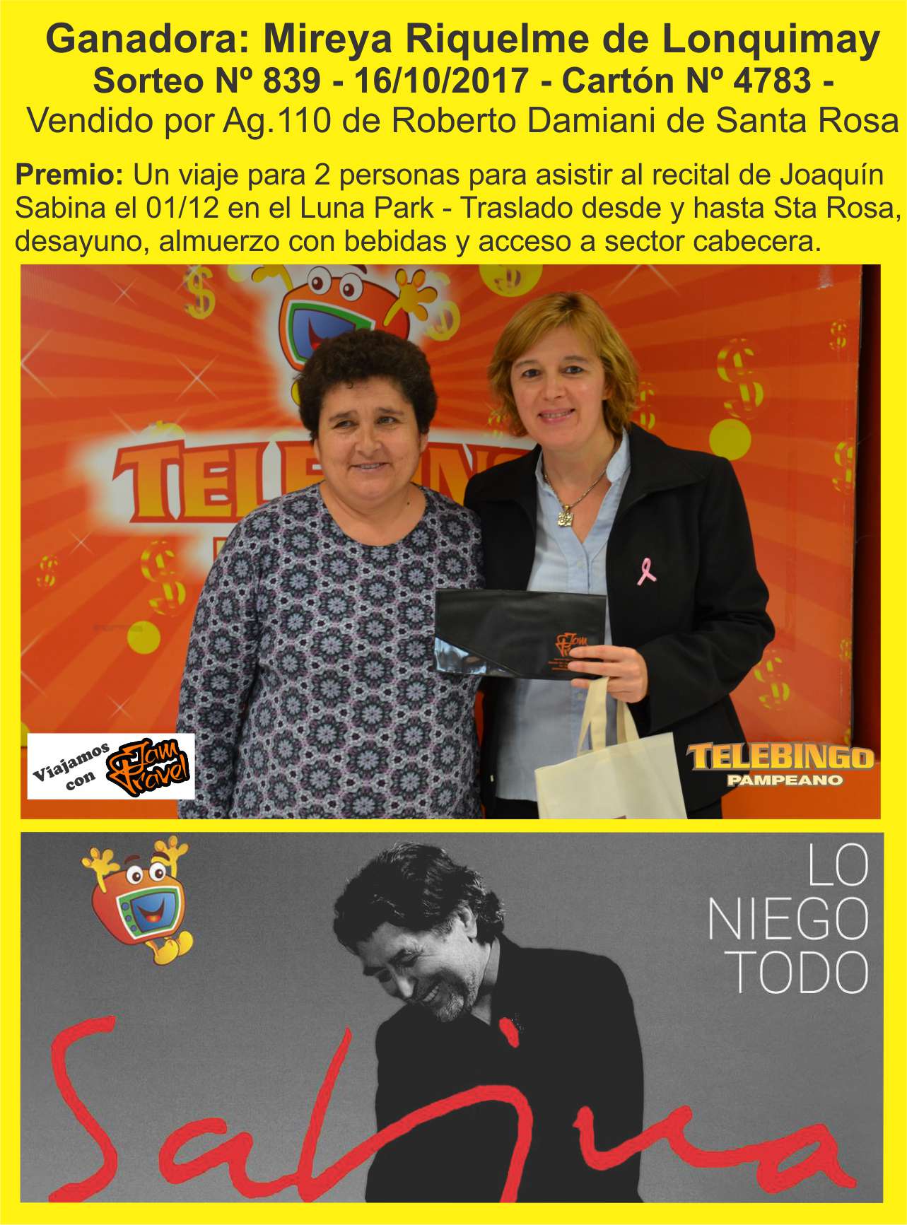 Ganadora Voucher Sabina 23 octubre, 2017 Pablo Osio Share List Ganadora Voucher para ir a ver a Sabina Mireya Riquelme Cartón Nº 4783 – Vendido por Agencia Nº 110 de Roberto Damiani de Santa Rosa.