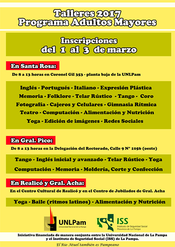 El Instituto de Seguridad Social informa que en el marco del Programa de Adultos Mayores y en financiamiento conjunto entre nuestra Institución y la Universidad Nacional de La Pampa, del 1 al 3 de marzo próximos se efectuará la inscripción de participantes, en la Unlpam, Coronel Gil 353, planta baja de 8.00 a 13.00 y en la Delegación del Rectorado en General Pico, Calle 9 N° 1056 (oeste) en los mismos días y horarios.
