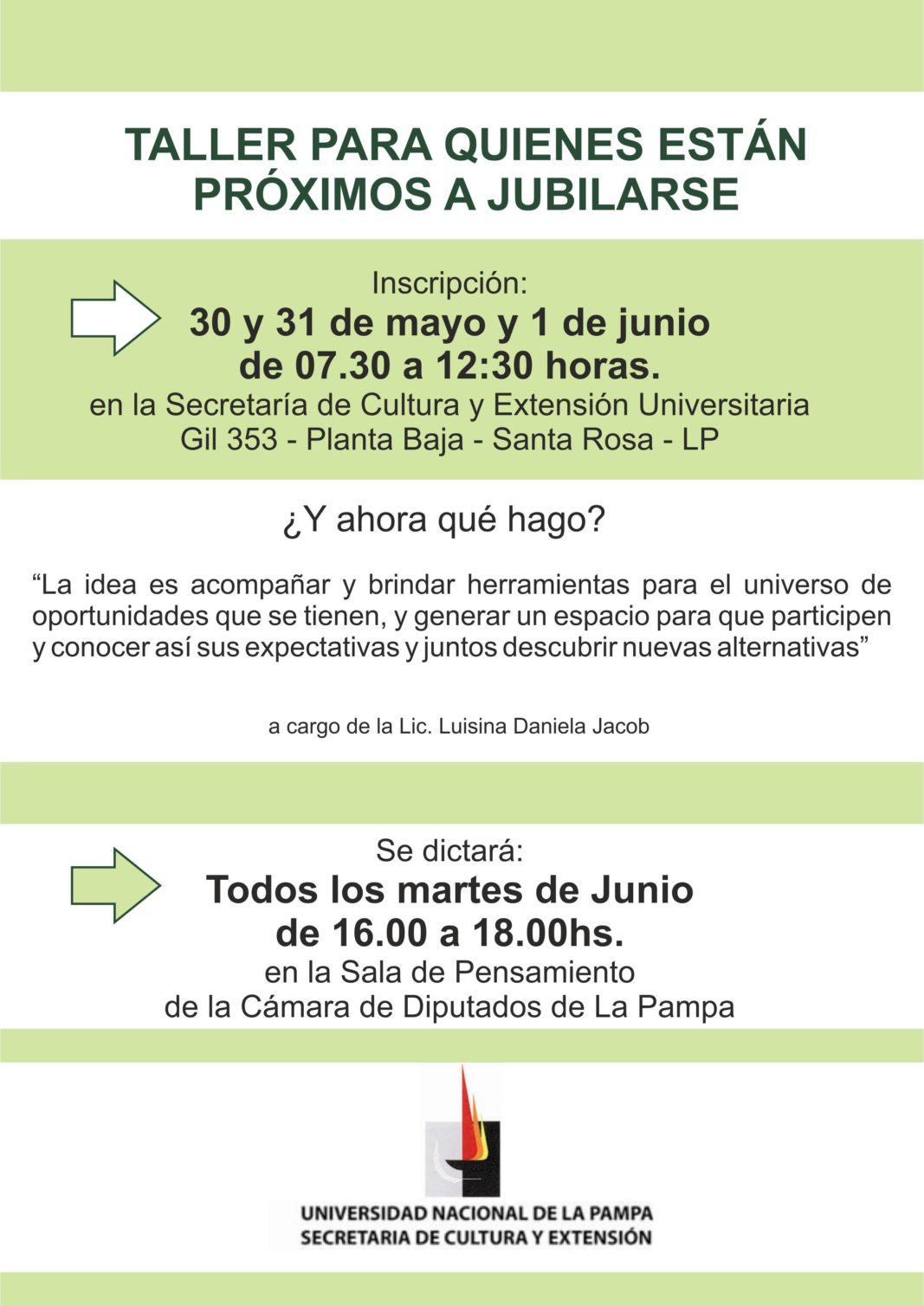 La Secretaría de Cultura y Extensión Universitaria de la UNLPam informa que durante los días martes del mes de junio, de 16 a 18 horas en la Sala de Pensamiento de la Cámara de Diputados de La Pampa se desarrollará un taller destinado a guiar o preparar a personas jubiladas o que están próximas a hacerlo. La propuesta estará a cargo de la Licenciada, Luisina Daniela Jacob.