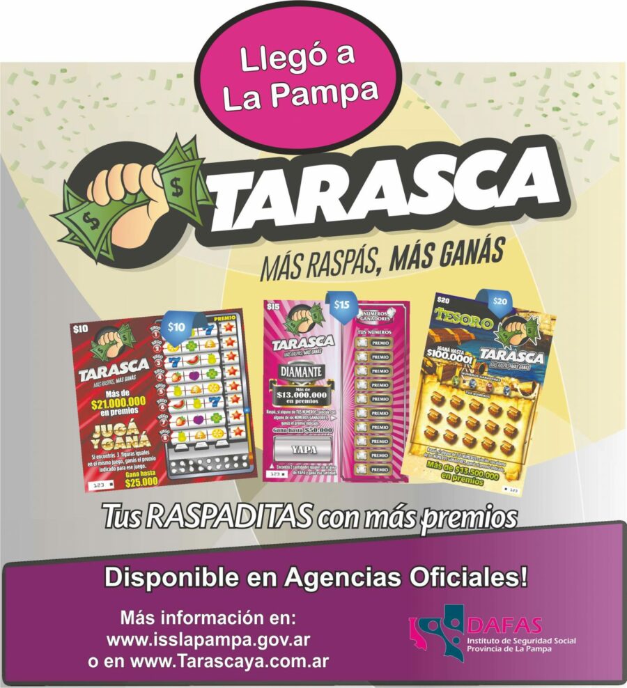 Tarasca es la nueva raspadita de Lotería de San Luis. Esta propuesta supera ampliamente a cualquiera porque ofrece más zonas de raspe, así los jugadores aumentan las chances de ganar de obtener premios en efectivo. Entonces ¡Más raspás, más ganas! En Buenos Aires cada serie está elaborada con una temática diferente, con diseños coloridos y atractivos. En total son cuatro raspaditas “Jugá y ganá” cuyo valor del cartón es de $10; cuatro cartones de Diamante, Esmeralda, Rubí y Zafiro, la raspadita cuesta $15; y cuatro “Tesoro”, de $20. En San Luis se suman los cartones que tienen un valor de $5 y la serie se denomina “Ganate 500”, y está compuesta por cuatro cartones de diferentes diseños y colores. ¡Más jugás, más ganás!