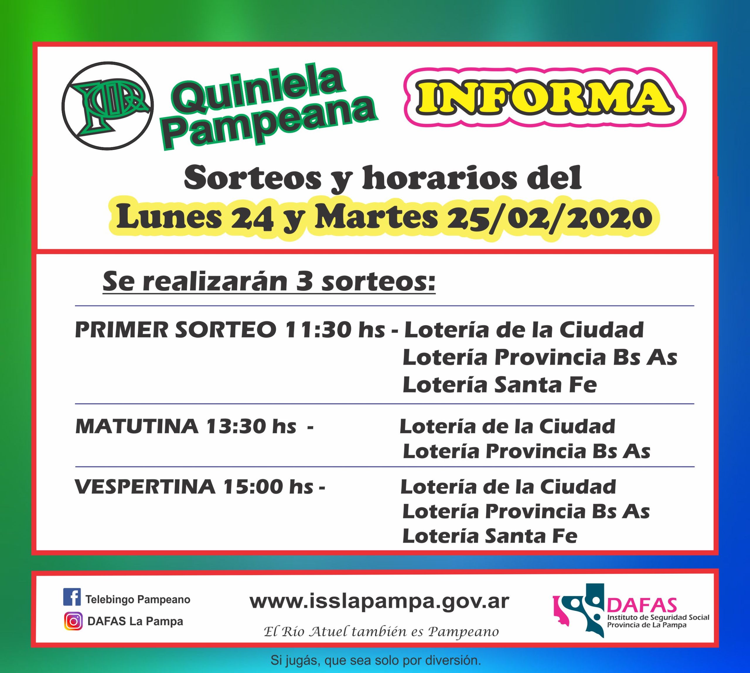 Horarios de sorteos para feriados de febrero 2020 21 febrero, 2020 Nancy Share List DAFAS informa los horarios de sorteos para feriado