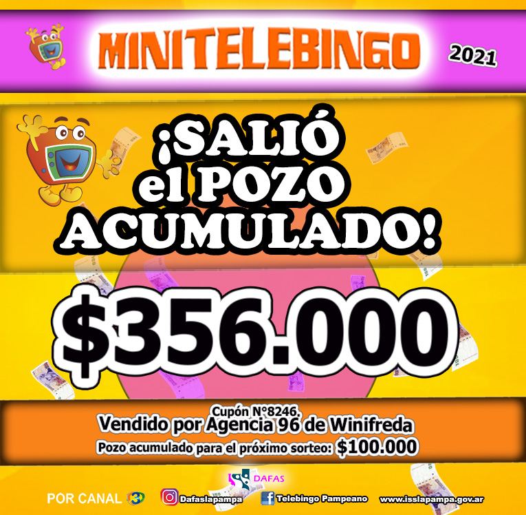 ¡Felicitaciones ganador o ganadora del POZO ACUMULADO de Minitelebingo Pampeano! El premio fue vendido por la agencia 96 de la localidad de WINIFREDA. TELEBINGO PAMPEANO siempre sale