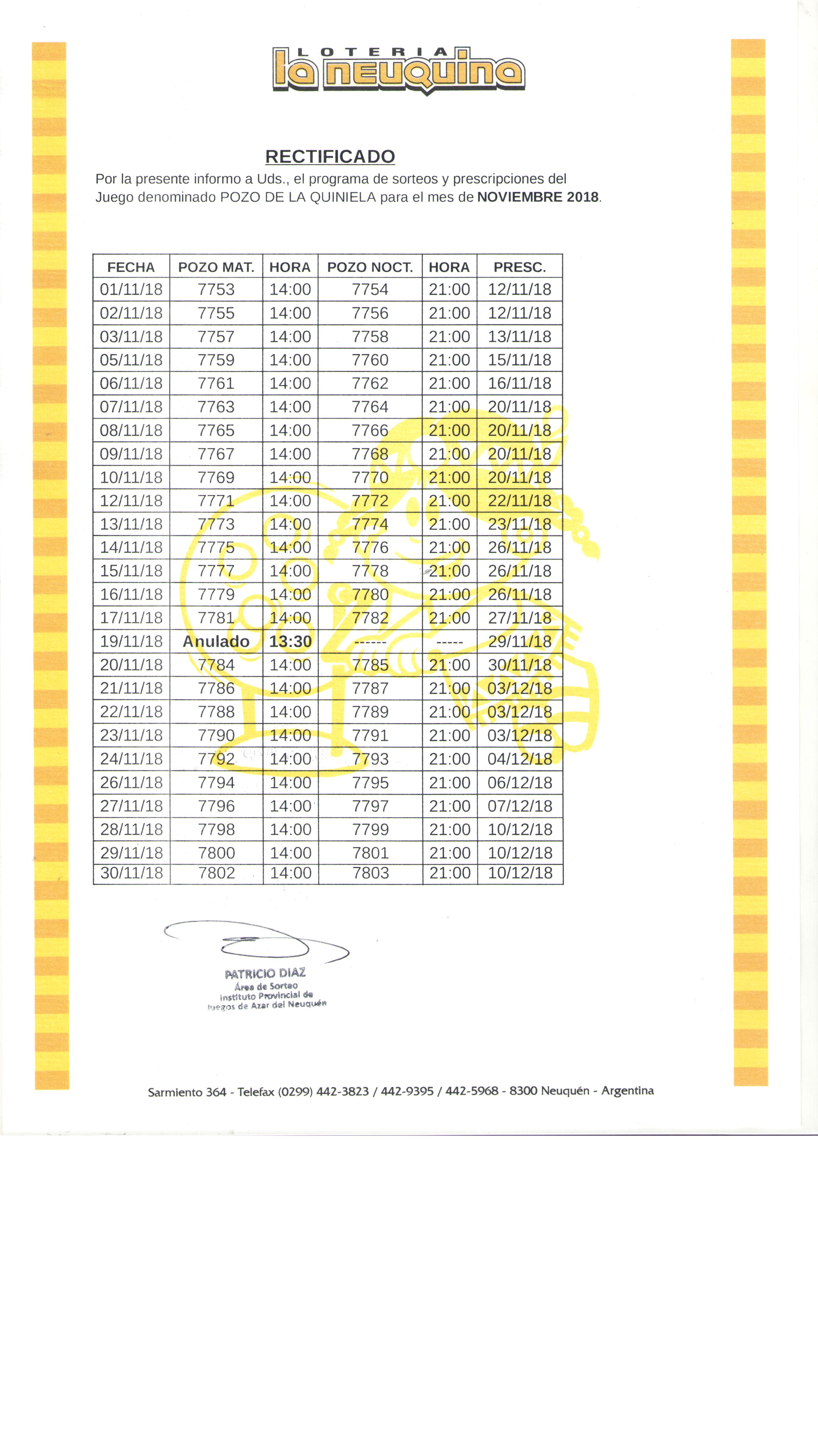 El día lunes 19 de noviembre de 2018 no se tomarán apuestas, quedando anulado el sorteo del Pozo de la Quiniela correspondientes a dicho día.