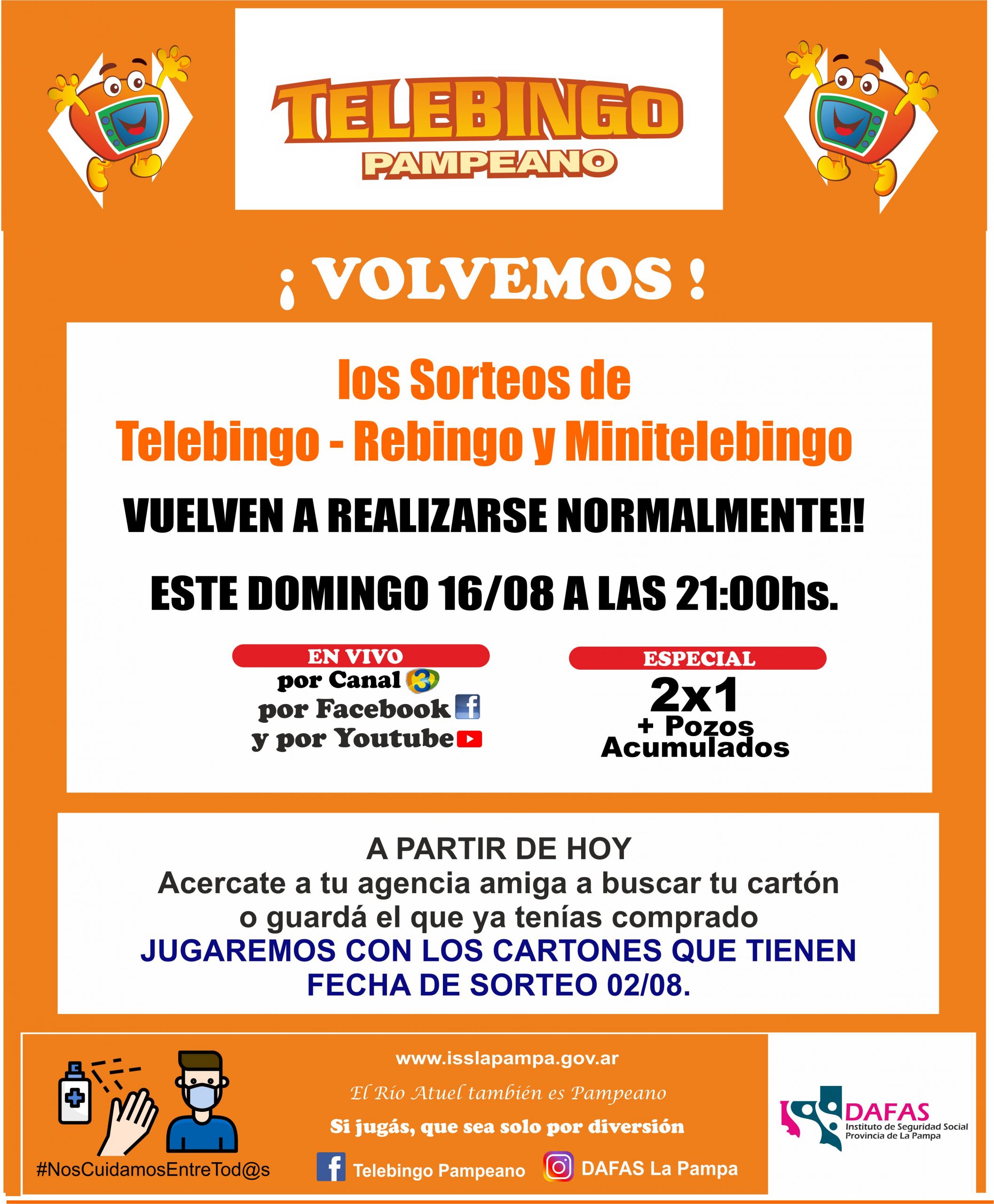 Telebingo Pampeano regresará este domingo 16, con un sorteo que pone en juego miles de pesos en premios. Se realizará sin presencia de público en la sala de juego y con los cartones correspondientes al sorteo del 02/08, que quedó pendiente al resolverse el retorno a la fase 1 de la ciudad de Santa Rosa.