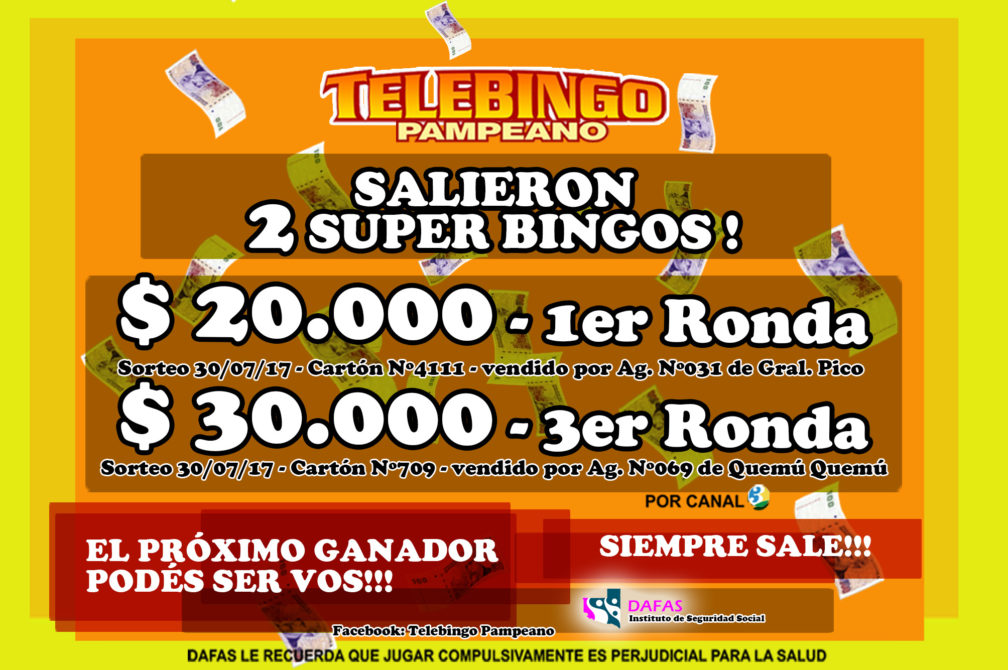 Telebingo – Salieron 2 Superbingos 31 julio, 2017 Pablo Osio Share List Salieron 2 SUPER BINGOS Super Bingo 1er Ronda – $ 20.000 Sorteo 30/07/17 – Cartón Nº4111 – vendido por Ag. Nº031 de Gral. Pico Super Bingo 3er Ronda – $ 30.000 Sorteo 30/07/17 – Cartón Nº709 – vendido por Ag. Nº069 de Quemú Quemú