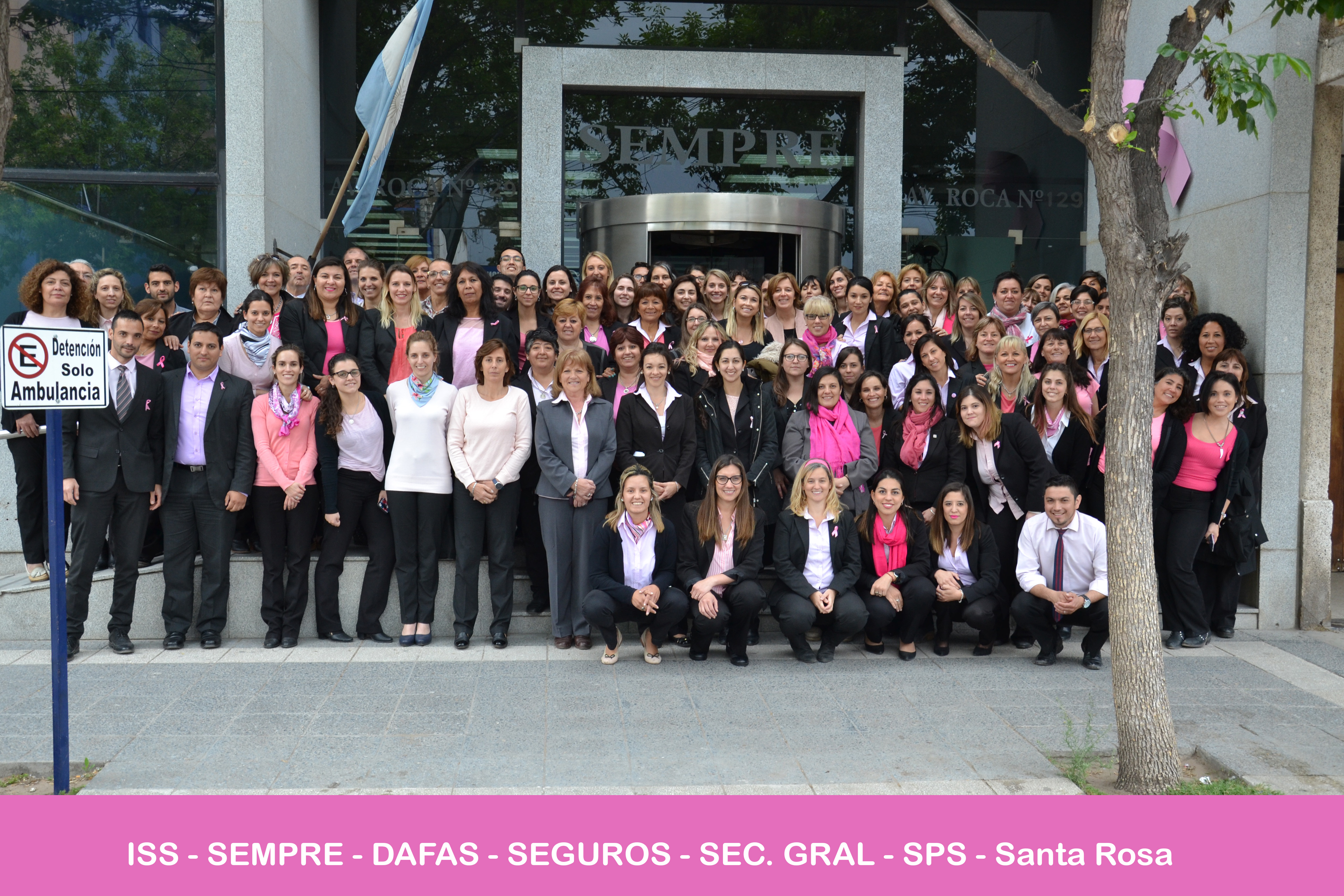 Para cerrar la jornada “Viernes Rosa”, personal de todos los organismos que integran el ISS participaron de una foto grupal afuera del edificio de SEMPRE en la ciudad de Santa Rosa. A la actividad institucional, también se sumaron trabajadores/as de otras delegaciones de nuestro organismo en las localidades de Victorica, 25 de Mayo, Realicó, Rancul, General Pico, CABA e Intendente Alvear.